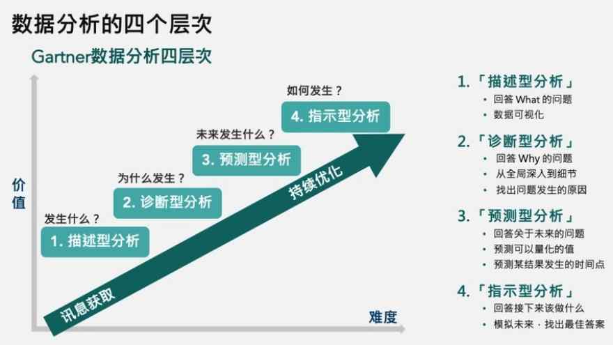 企業數據分析的四個層次包括:發現問題-描述性分析、分析問題-診斷性分析、預測問題預測性分析、指導決策-處方性分析。