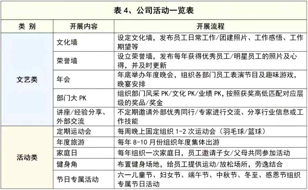 企業內其它員工關懷包括包括多種文藝、活動,比如文化墻、榮譽墻、年會、部門風采、行業交流,以及運動會、年度旅游、家庭日、健身角、節日專屬活動等。