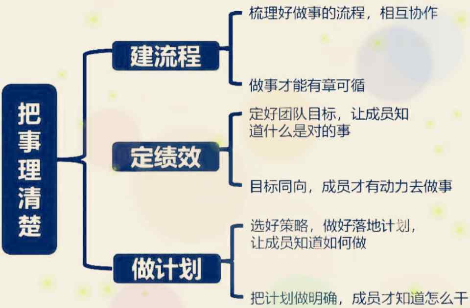 管事包包括定目標、建流程、監控、考核,至于順序有不同的說法。有人說先訂目標,因為目標意味著方想和未來;有人說要先定流程,因為流程是做管理的關鍵,需要識別好關鍵環節。