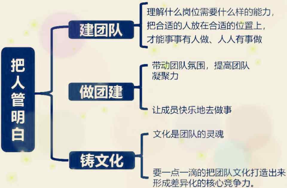 管理人需要做到建立團隊、建設團隊、塑造文化,管理人的時候要把人和事結合起來,實現企業人崗匹配、團隊氛圍恰到好處、團隊文化適應企業核心競爭力的發展。