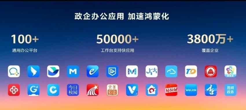 目前鴻蒙已經(jīng)具有超過100個通用辦公平臺,超過5萬個工作臺支持應用,覆蓋的企業(yè)超過3,800萬家。