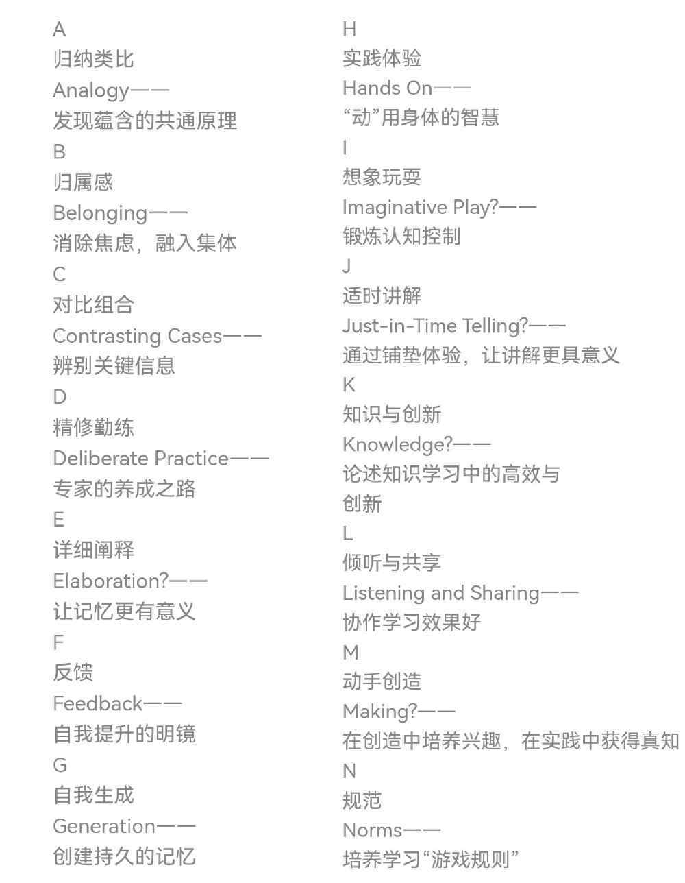 這些方法包括:歸納類比-發(fā)現(xiàn)共通、歸屬感-融入集體、對(duì)比組合-辨別關(guān)鍵信息、精修勤練-成為專家、詳細(xì)闡釋-理解意義、反饋-自我提升、自我生成-持久記憶;實(shí)踐體驗(yàn)-身體記憶、想象玩耍-提高認(rèn)知控制、適時(shí)講解-鋪墊體驗(yàn)提升意義、知識(shí)高效學(xué)習(xí)與創(chuàng)新、傾聽與共享-協(xié)作學(xué)習(xí)、動(dòng)手創(chuàng)造-培養(yǎng)興趣、規(guī)范-培養(yǎng)學(xué)習(xí)規(guī)則。