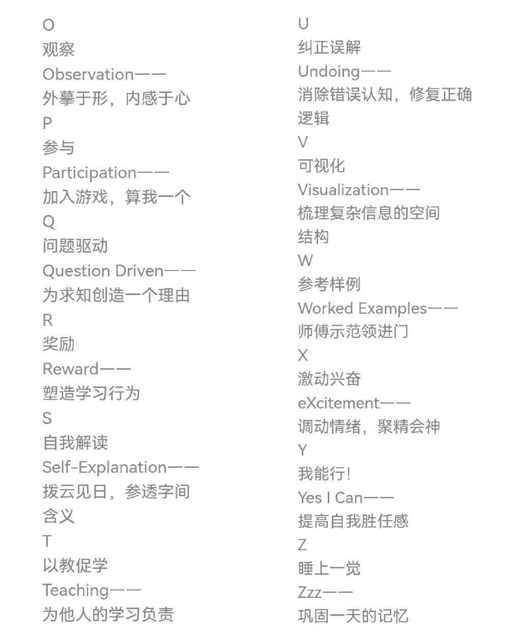 以及觀察-摹于形感于心、參與-加入游戲、問題驅(qū)動(dòng)-驅(qū)動(dòng)求知、獎(jiǎng)勵(lì)-塑造形象、自我解讀-參透字間含義、以教促學(xué)-共同提升,糾正誤解-認(rèn)知正確邏輯、可視化-梳理空間結(jié)構(gòu)、參考樣例-示范和模仿、激動(dòng)興奮-高效學(xué)習(xí)、我能行-提高勝任感、睡上一覺-休息鞏固記憶!