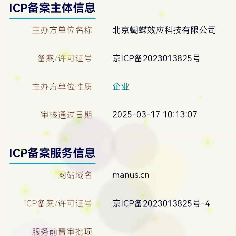 據悉,北京蝴蝶效應公司(Manus的研發和運營方)也就是備案了manus.cn域名,有可能啟用并作為manus中文版的主域名,到時候Manus將以更加專業和接地氣的姿態呈現給大家。