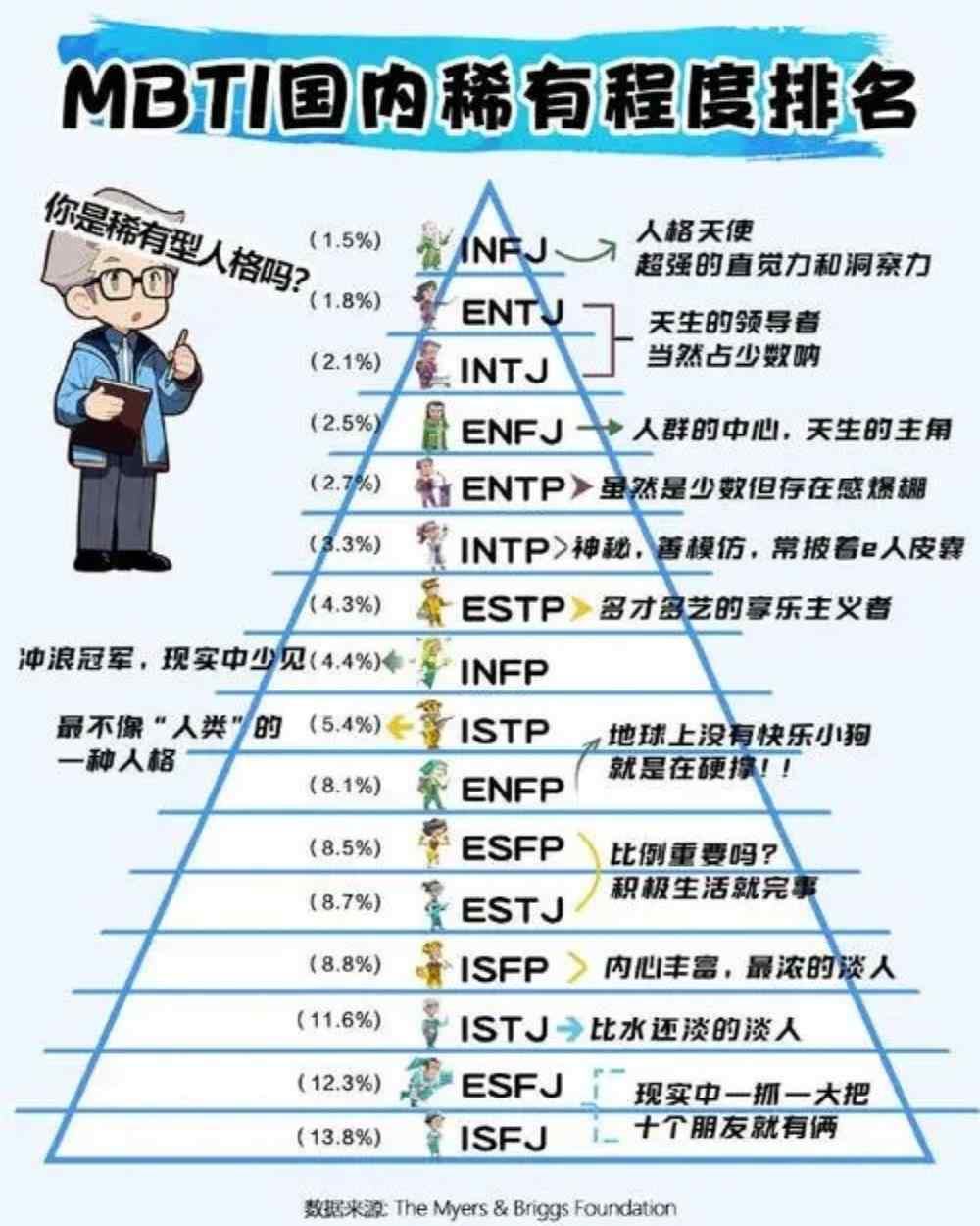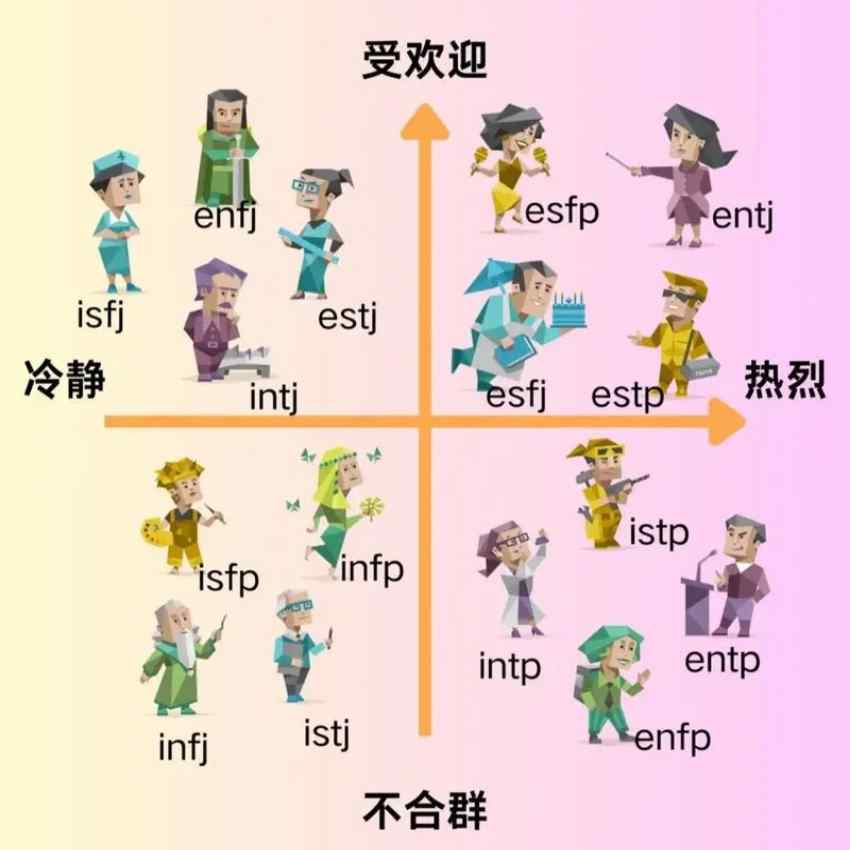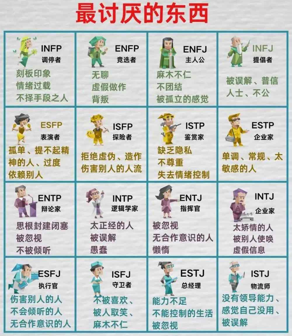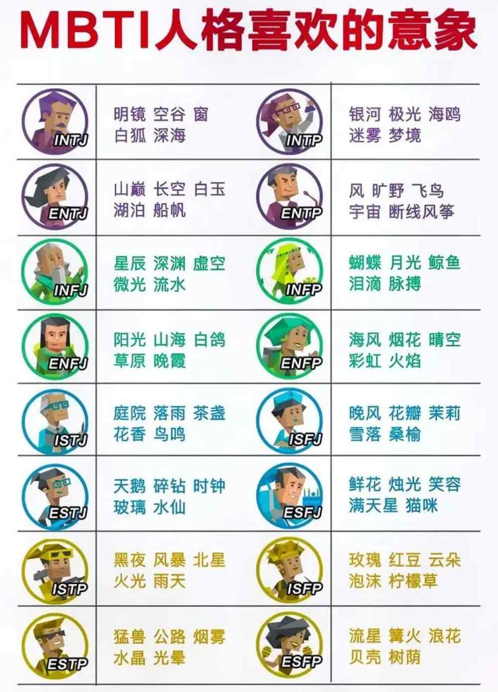 ISTJ:實際、有責任感,注重傳統和忠誠。ISFJ:友好、有責任感,忠誠、體貼他人的感受。INFJ:尋求意義和聯系,洞察力強,堅持自己的價值觀。INTJ:創新且動力非凡,獨立且要求高。ISTP:靈活、忍耐力強,善于分析事物運作原理。ISFP:友好、敏感,享受當前生活,不喜歡沖突。ESTP:實際、注重結果,喜歡積極解決問題。ESFP:外向、友好,熱愛生活,適應力強。ENFP:熱情洋溢、富有想象力,尋求可能性。ENTP:反應快、睿智,善于激勵別人。ESTJ:實際、果斷,善于組織項目和人員。ESFJ:熱心腸、合作,希望環境溫馨和諧。ENFJ:熱情、為他人著想,善于發現潛能。ENTJ:坦誠、果斷,天生領導者 。INFP:理想主義,忠于自己和他人的價值。 INTP:對概念有偏好,理論性強,重視智力運用