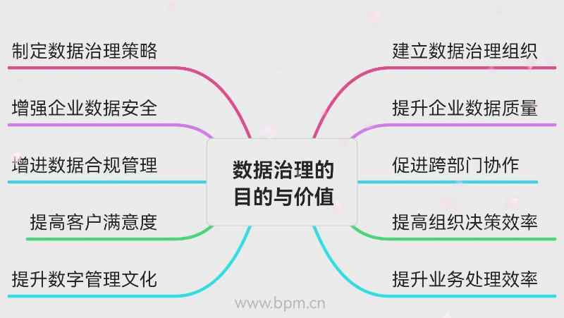 企業數據治理是為了提升數據的價值,搭建企業的數據治理管理體系,促進跨部門協作,提高組織決策效率和業務處理效率,支撐企業的數字化戰略,培養企業數字化文化。