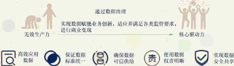 在《數據治理時代的數據治理》一書中,作者提到通過數據治理,可以實現無效生產力到核心驅動力的轉變,并且同時實現數據賦能與業務創新、滿足各類監管要求、實現商業變現等。