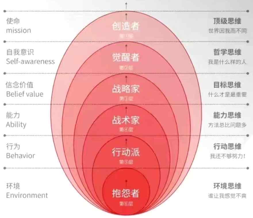 不同人的思維方式和認知層次不同,根據思維層次的不同,可以將它分為六層:環境思維、行動思維、能力思維、目標思維、哲學思維、頂級思維。分別對應著不同的高度:抱怨者、行動派、戰術家、戰略家、覺醒者、創造者。