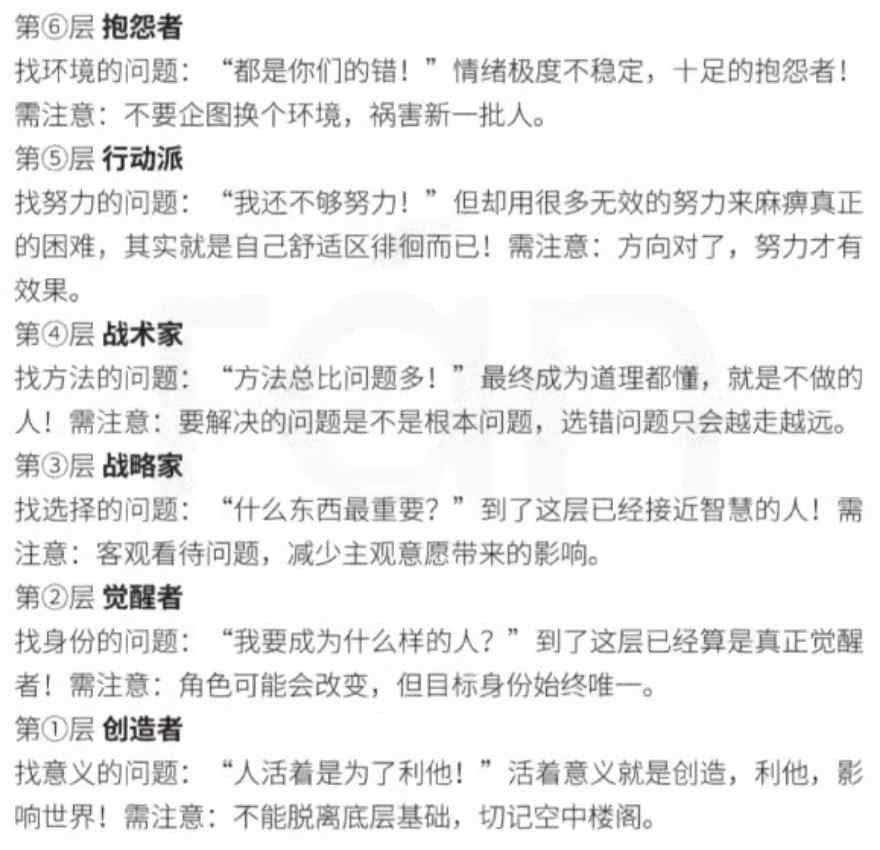 思維層次的六層詳細描述:抱怨者總是找外在的問題;行動派找努力不夠的問題;戰術家找方法不對的問題;戰術家有信念和價值,找選擇不對的問題;覺醒者自我認識清晰,定義自己的目標身份并做事;創造者利他,為了使命和價值觀存在。