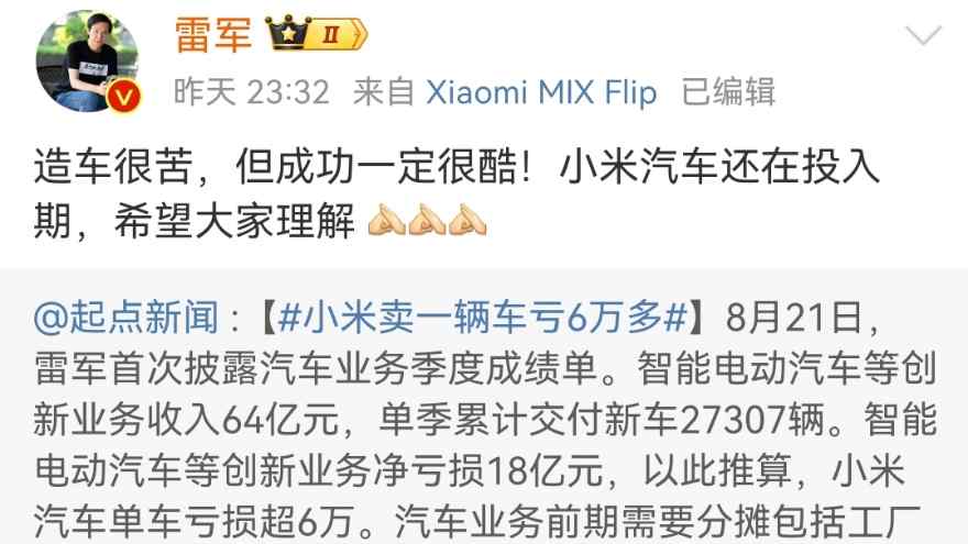 雷軍8月22日又轉發信息,解釋汽車業務為什么前期是虧損的。主要原因是汽車業務前期需要分攤成本,包括前期的工廠建設、技術研發、人員成本、門店建設等費用,前期的報告上的業務虧損屬正常情況。