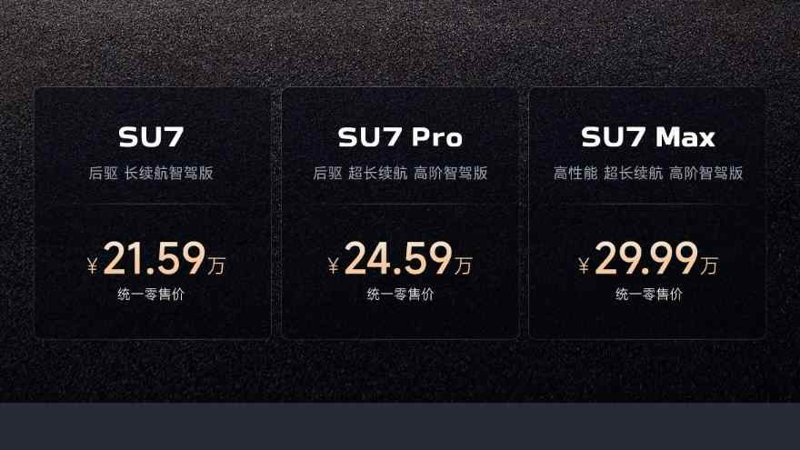 小米SU7標準版定價21.59萬元,小米SU7 Pro定價24.59萬,小米SU7 Max定價29.99萬元。