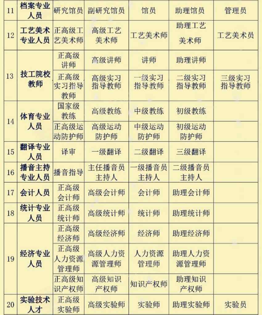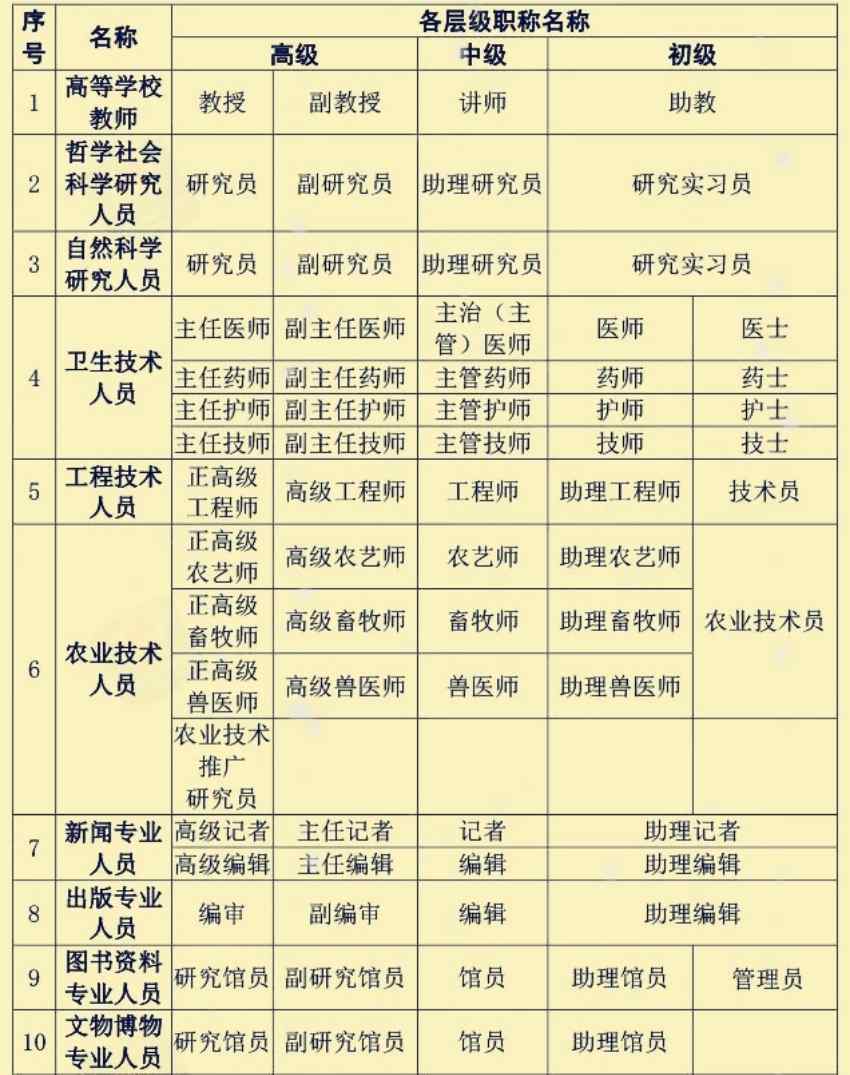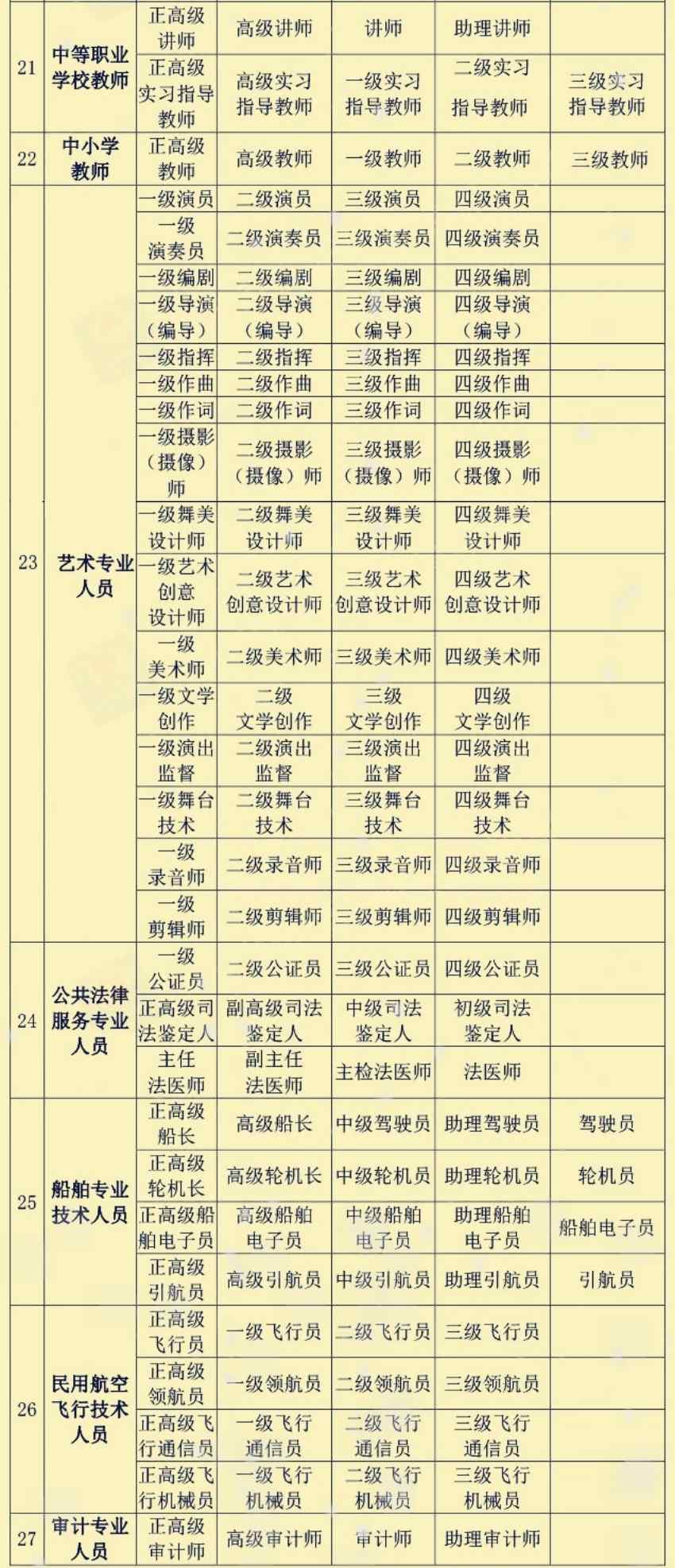 職稱有哪些分類和層級?全部的27個職稱系列或專業的各層級名稱 創未來 2024-10-08 3183 0 職稱認定是很多職場人需要面對的事情,特別是在很多國企、事業單位。 職稱認定27個職稱系列或專業。職稱層級分為高級、中級、初級,而每一個職稱系列或專業,職稱層級又有不同的劃分。 27個職稱系列或專業及層級對應如下: 職稱認定 << MBTI的16種人格:INTJ、INTP、ENTJ、ENTP、INFJ、INFP、ENFJ、ENFP、ISTJ、ISFJ、ESTJ、ESFJ、ISTP、ISFP、ESTP、ESFP 特斯拉10月10日洛杉磯舉辦“We, Robot”發布會:展示Robotcab、Robovan、Optimus等多款未來產品 >> 您可以還會對下面的文章感興趣: 什么是專家?如何成為一名真正的專家?成為專家的流程步驟有哪些? 相關文章 AI時代有三類高危職業:程序員、設計師和SOP重復性工作者(如客服、法律崗) 長城汽車魏建軍宣布啟動“35+計劃”,專場招聘35歲以上人才 辨析PUA、情緒價值與正能量的區別:守護積極健康人際交往 做好未來布局(每日、每周、每月、每年):養成好習慣、消除內耗、提升知識和認知、強健身體、定期復盤 美的簡化工作的方法:簡化材料、自己寫材料、下班不開會、減少微信群、使用數字看板、合理團建 什么是表演式加班?表演式加班的不同表現,企業如何規避表演式加班? 馬斯克談五步工作法:審視問題、去繁就簡、優化流程、效率改善、自動化 職場中PUA與NPD的區別,如何避免職場中出現PUA和NPD的問題?